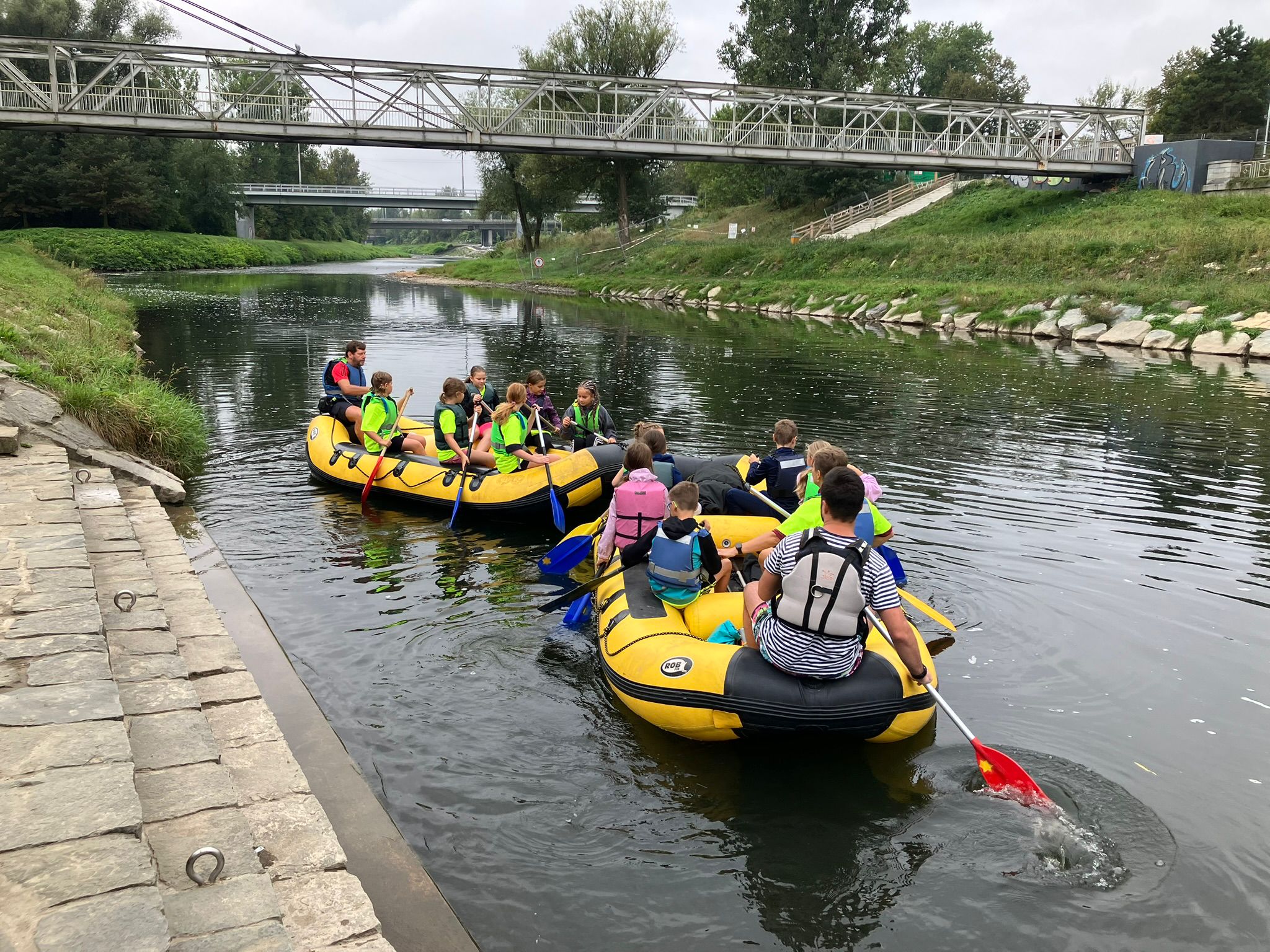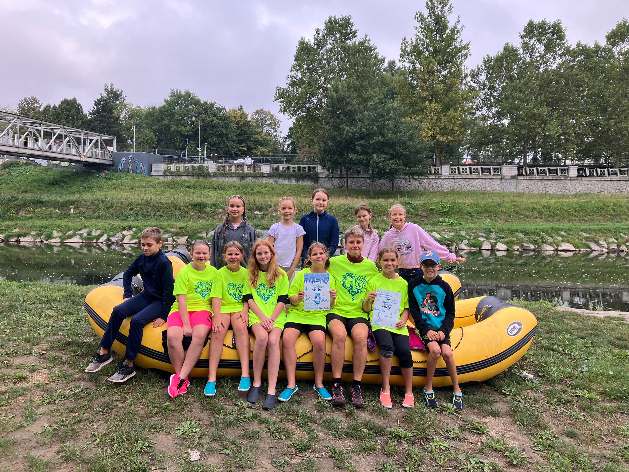 V loňském školním roce zvítězili žáci současné III. B (3. a 5. ročník) v soutěži Hledej pramen vody, pořádané společností Ostravské vodárny a kanalizace a. s., a obdrželi finanční odměnu v hodnotě 15 000 Kč. S touto podporou jsme chtěli dětem nabídnout netradiční zážitek spojený s vodou. V neděli 7. 9. 2025 jsme se proto vydali na rafty, na kterých jsme sjížděli řeku Ostravici v úseku od loděnice u Slezskoostravského hradu až do Koblova.