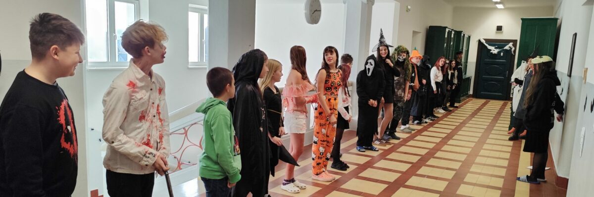 Den před samotným Halloweenem strávila třída 9.A ve škole společný večer s přespáním, aby mohla vše dokonale připravit. Nechyběla zábava, strašidelná výzdoba ani napětí při finálních přípravách. A že se letos deváťáci opravdu překonali! Pro mladší spolužáky připravili netradiční halloweenský den s jednotným tématem – pátrání po záhadném pachateli, který „ubližoval dětem“.