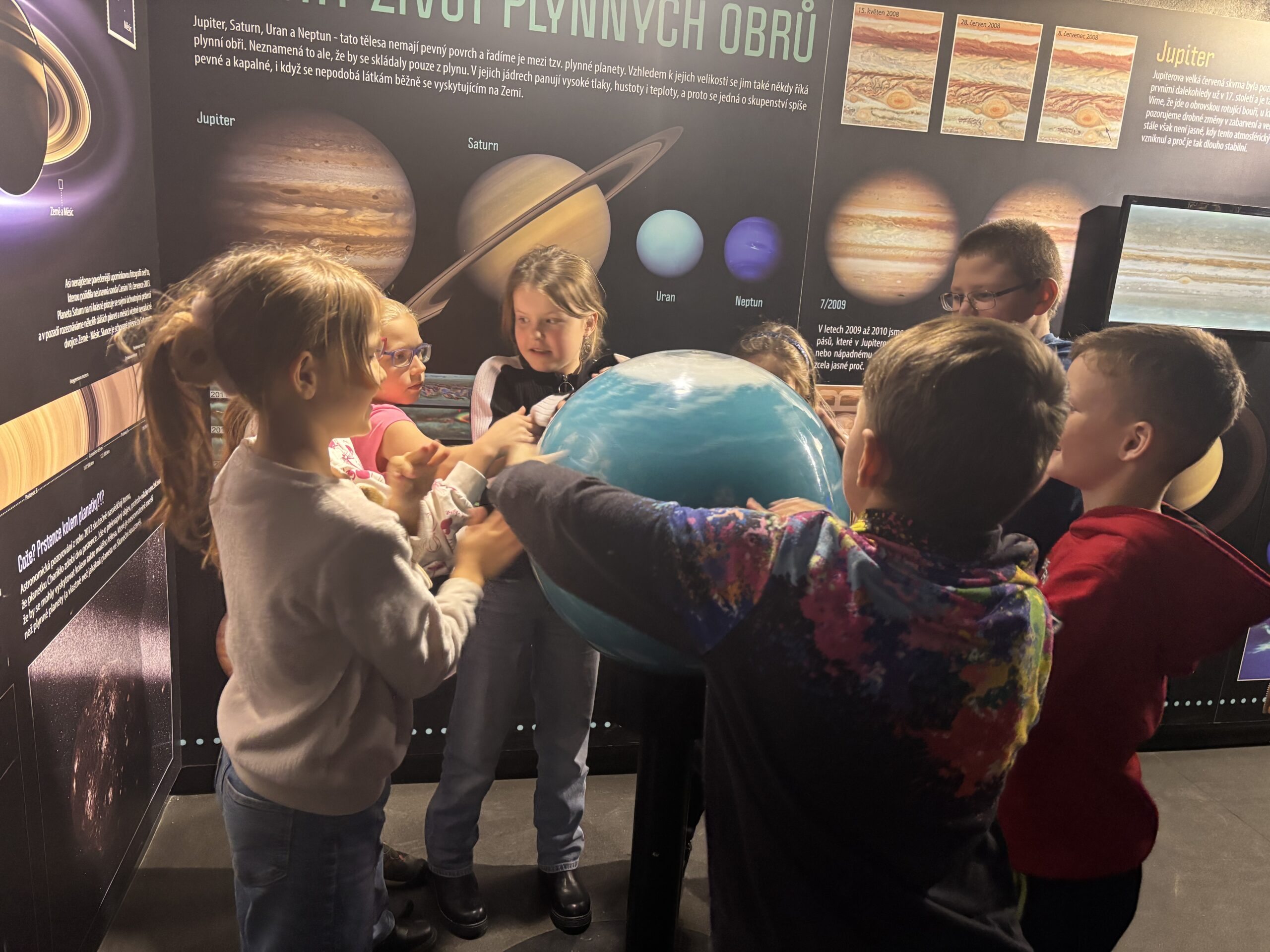 Ve sférickém kině je čekal poutavý program o planetách, pohybu těles ve Sluneční soustavě i dalších fascinujících úkazech, které se odehrávají nad našimi hlavami. Poté si v interaktivní expozici mohli vyzkoušet řadu modelů a pokusů – například simulaci pohybu planet, model zatmění Slunce či model tsunami. Zároveň si prohlédli výstavu připravenou k 45. výročí Planetária Ostrava.