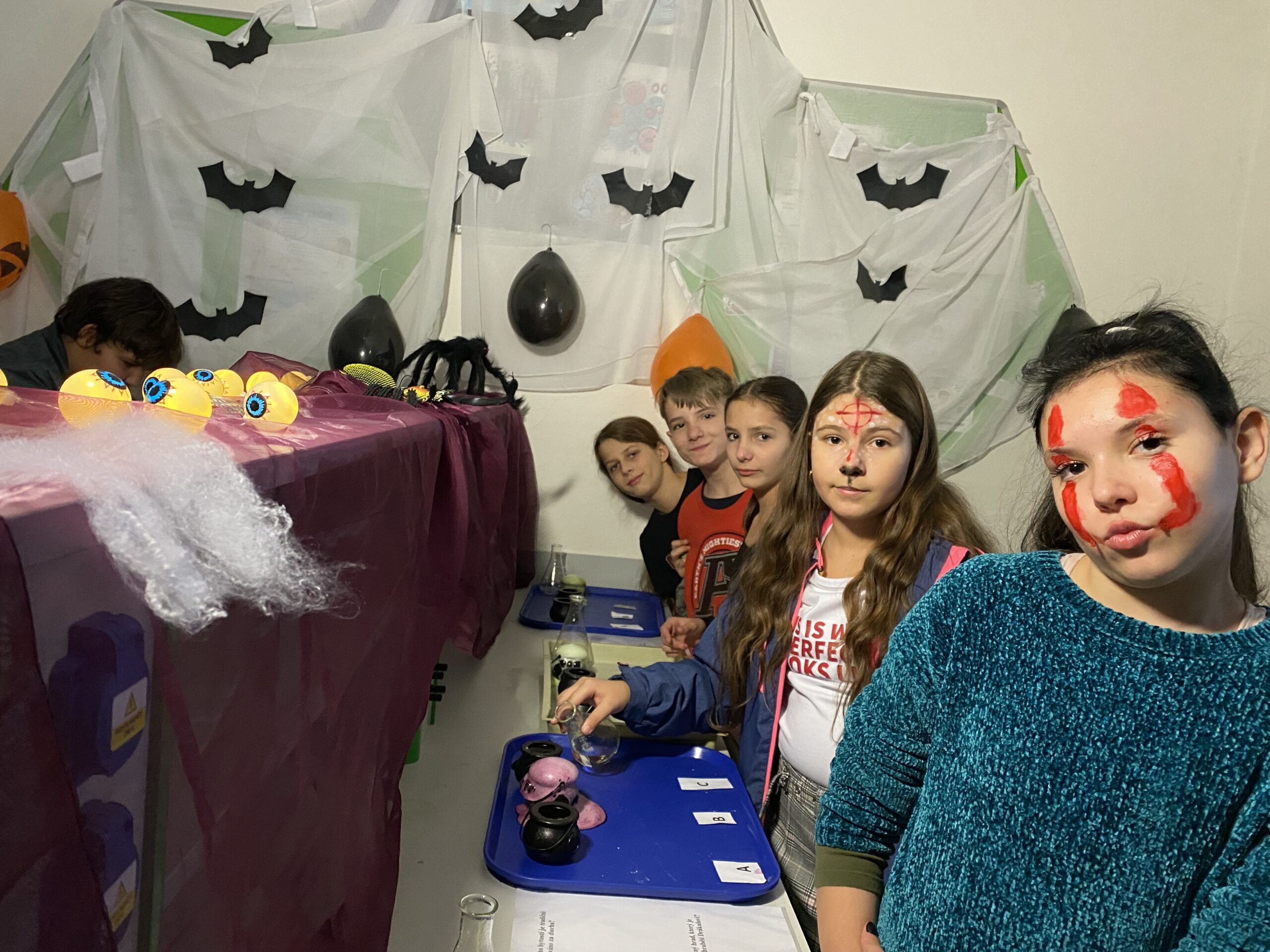 Den před samotným Halloweenem strávila třída 9.A ve škole společný večer s přespáním, aby mohla vše dokonale připravit. Nechyběla zábava, strašidelná výzdoba ani napětí při finálních přípravách. A že se letos deváťáci opravdu překonali! Pro mladší spolužáky připravili netradiční halloweenský den s jednotným tématem – pátrání po záhadném pachateli, který „ubližoval dětem“.