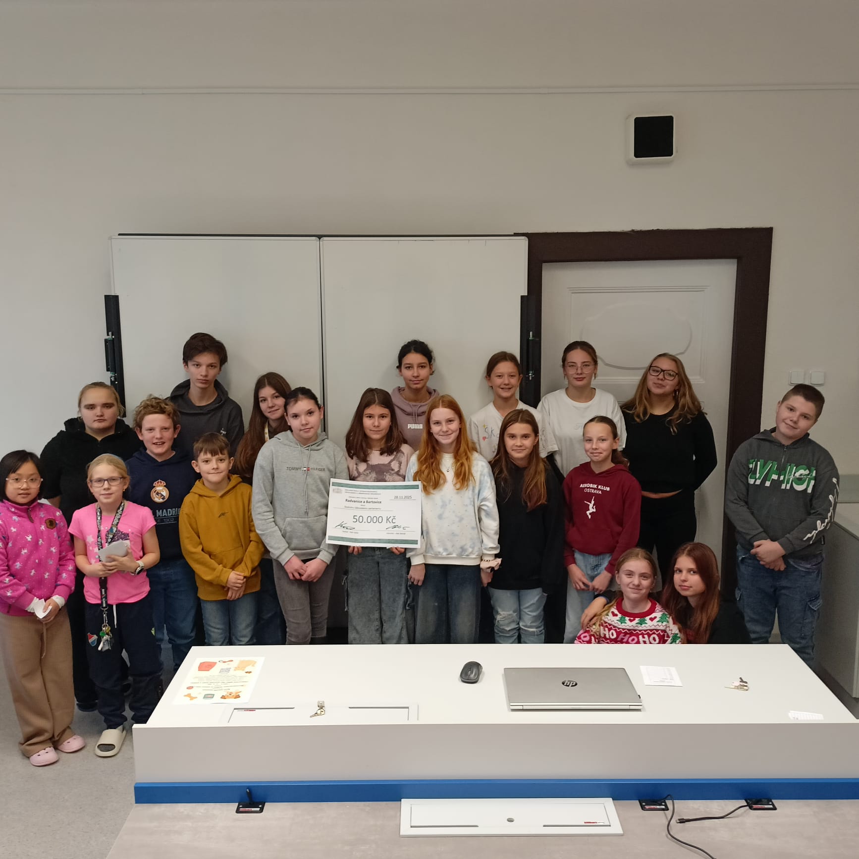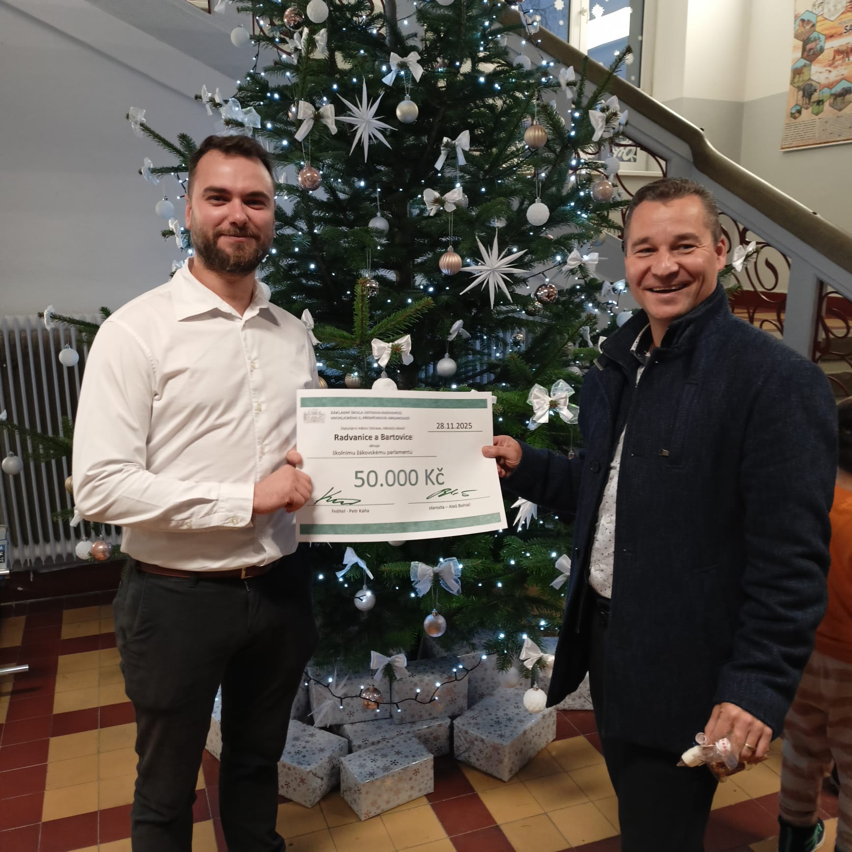 Během letošního Vánočního jarmarku předal pan starosta městského obvodu Radvanice a Bartovice Aleš Boháč škole šek v hodnotě 50 000 korun určený na podporu žákovského parlamentu.