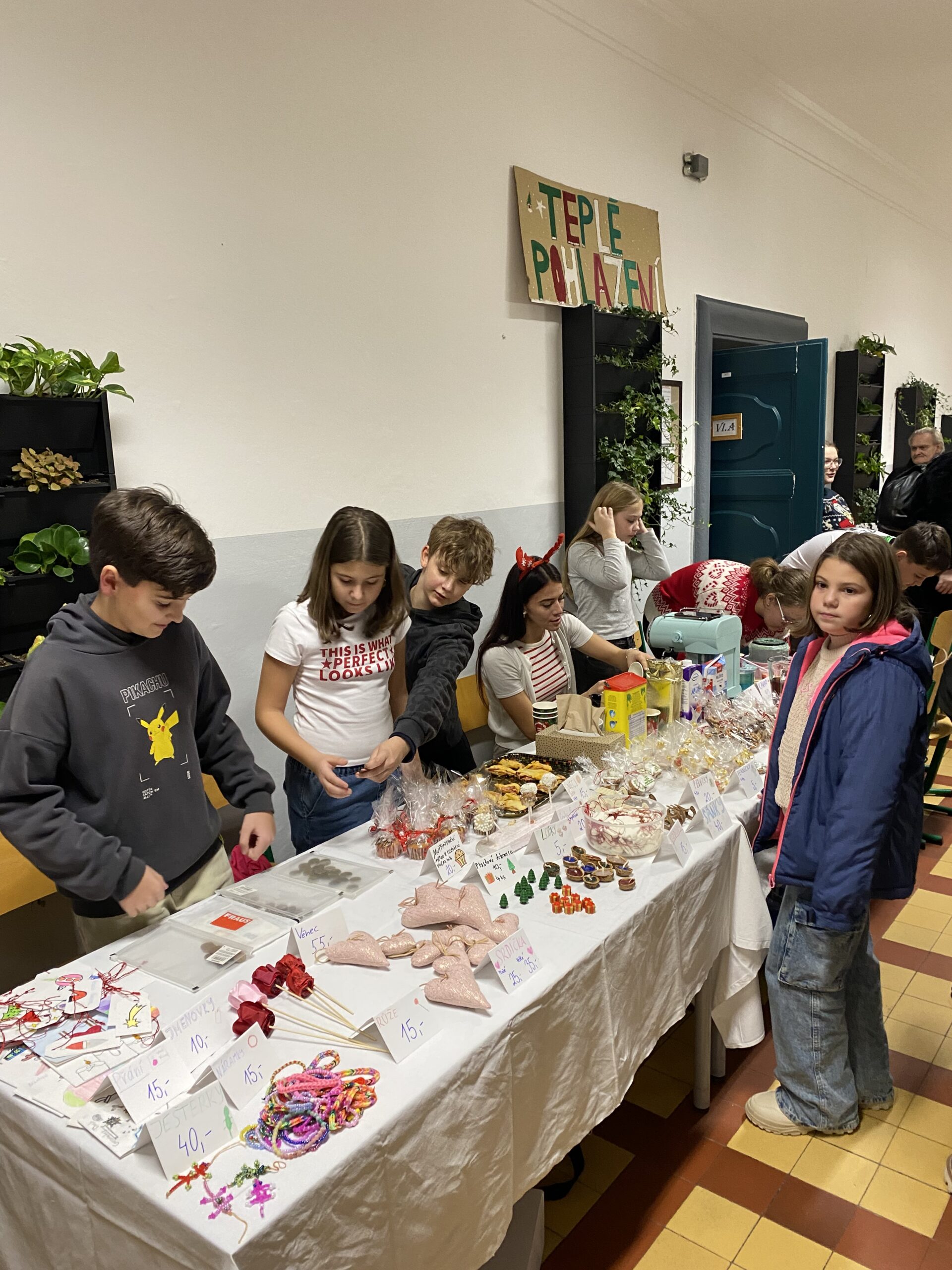 Do příprav se zapojila celá škola – od nejmenších prvňáčků až po zkušené deváťáky. Společně se školní družinou a kuchyní vytvořili pestrou paletu rukodělných výrobků: zdobené ozdoby, adventní dekorace, drobné dárky i domácí dobroty. Každá třída vtiskla svým výrobkům vlastní nápady, čas i energii, takže si návštěvníci domů odnášeli nejen krásné předměty, ale i kousek práce a nadšení jejich autorů.