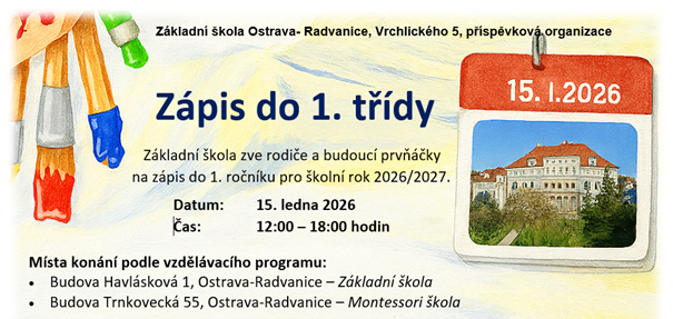 Zápis do první třídy Montessori programu proběhne ve čtvrtek 15. ledna od 12:00 do 18:00 v prostorách ZŠ Trnkovecká (budova školy na ulici Trnkovecká 867/55, Ostrava Radvanice). Na děti čekají hravá stanoviště, na rodiče administrativní část zápisu, popovídání s učitelkami a vyplnění motivačního dotazníku.